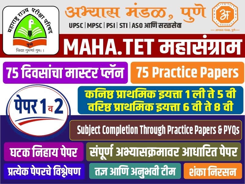 - कनिष्ठ प्राथमिक इयत्ता १ ली ते ५ वी - वरिष्ठ प्राथमिक इयत्ता 6 वी ते 8 वी - 75 दिवसांचा मास्टर प्लॅन - 75 दिवस 75 पेपर - Subject Completion Through Practice Papers & PYQs - घटक निहाय पेपर - संपूर्ण अभ्यासक्रमावर आधारित पेपर - प्रत्येक पेपरचे विश्लेषण - सर्वोत्कृष्ट आणि तज्ञ अनुभवी टीम - शंका निरसन